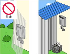 給湯機器のまわりに物を置いたり、波板などで囲わないでください。